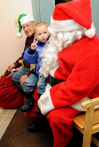 “I want ‘Superman 2’ and a plow truck that plows snow,” Maverick Mears, 4, from Livermore Falls told Santa Claus after Turner’s Christmas tree lighting Monday evening. After his visit with Jolly St. Nick, Mears was given a gift from “Santa’s helper,” Turner Selectman Richard Keene, left. All of the kids and their parents were treated to refreshments from Ricker Hill Orchard, Hannaford, Community Credit Union and Food City. Mrs. Claus read “The Night Before Christmas” to the children.