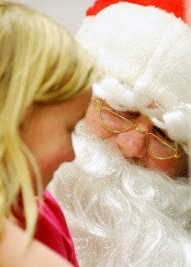 Santa Claus listens to Abigail Lazarou, 8, as she asks for a ZhuZhu Pet, Barbie toys and the video “Grandma Got Ran Over by a Reindeer” Monday night in Turner.