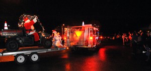 Santa Claus arrives on a decorated Turner fire truck Monday evening before the lighting of the town’s Christmas tree.