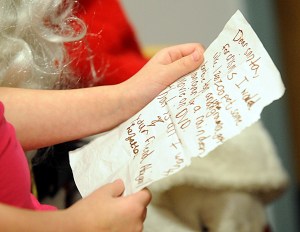 Abigail Lazarou, 8, of Turner reads her Christmas list to Santa on Monday in Turner.