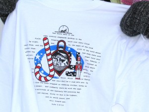 She brought 206 shirts to Friday’s food drive. On the front is a design with the word “Joy,” spelled out using a candy cane, critters and a Nutcracker toy soldier. That is surrounded by the Christmas story from Luke 2:8-14, in the shape of a Christmas ornament with a blue star-laden band that Lane described as the aurora borealis.