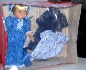 Barbara Lane was also selling chances on an 14-inch-tall American Girl-type doll, for which Elizabeth Lane had made three outfits. The doll is wearing a blue floral, country-style dress with a bonnet, both trimmed in lace, with a blue ribbon that Barbara Lane said her mom won after entering the ensemble in the Cumberland Fair.
