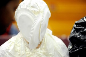 English language learner teacher Jill Hyland takes her fair share of pies to the face during a fundraiser at Edward Little High School in Auburn on Thursday. Students paid $1 for a pie to throw at one of 17 staff members to raise money for the school’s food pantry and The Lunchbox Fund, a nonprofit organization that provides daily meals to students in South Africa.