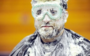 Physics teacher Evan Cyr wears whipped cream from a pie thrown during a fundraiser at Edward Little High School in Auburn on Thursday. Students paid $1 for a pie to throw at one of 17 staff members to raise money for the school’s food pantry and The Lunchbox Fund, a nonprofit organization that provides daily meals to students in South Africa.