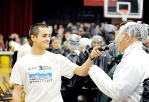 Emcee Jake Bazinet interviews Edward Little High School Assistant Principal Steve Galway during a pie-throwing fundraiser at the Auburn school Thursday. Students paid $1 for a pie to throw at one of 17 staff members to raise money for the school’s food pantry and The Lunchbox Fund, a nonprofit organization that provides daily meals to students in South Africa. Students threw 97 pies.
