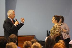 In anticipation of his visit, students questioned Michaud on a variety of topics, from work he undertook to the similarities between working at a paper mill and in the House of Representatives, to whether he believed in making personal monetary contributions a cause.