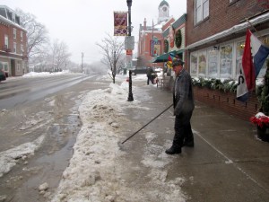 Lowell, who clears the sidewalks for about a half-dozen downtown businesses, was expecting to spend the day outside in the rain, which was heavy at times. He was taking it in stride.