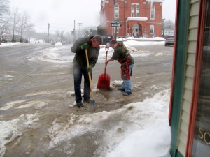 FARMINGTON — Expecting the slush on the sidewalk to freeze once temperatures dropped, George Lowell of New Vineyard worked to clear the area in front of Mooseville on Monday morning.