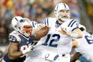 Billed as a matchup between quarterbacks — long-time great Tom Brady and second-year star Luck — the Patriots’ leader was content to hand off while Luck threw an interception on his second pass and never found consistency. He threw two touchdown passes to LaVon Brazill but also threw four interceptions.