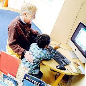 U.S. Sen. Angus King, I-Maine, helps Amaar Abdulrahman, 5, write his name on a computer at Androscoggin Head Start at the Webster School Community Center in Auburn on Wednesday. King had lunch with students and parents and talked with staff about federal cuts that removed 15 students from the program, Head Start Director Betsy Norcross Plourde said. The U.S. Senate has since restored the money. “The funds will allow us to bring children back,” Norcross Plourde said. “We know we have a need. We have a waiting list of 100 children in Androscoggin County.” Reading a children’s book at left are 4-year-old Willow Giasson, far left, site supervisor Mary Ratsavong and Alyssa Splude, 3.
