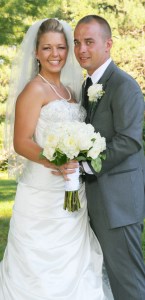 The bride wore a satin gown with lace bodice and train. She carried a bouquet of white garden roses and hydrangea.