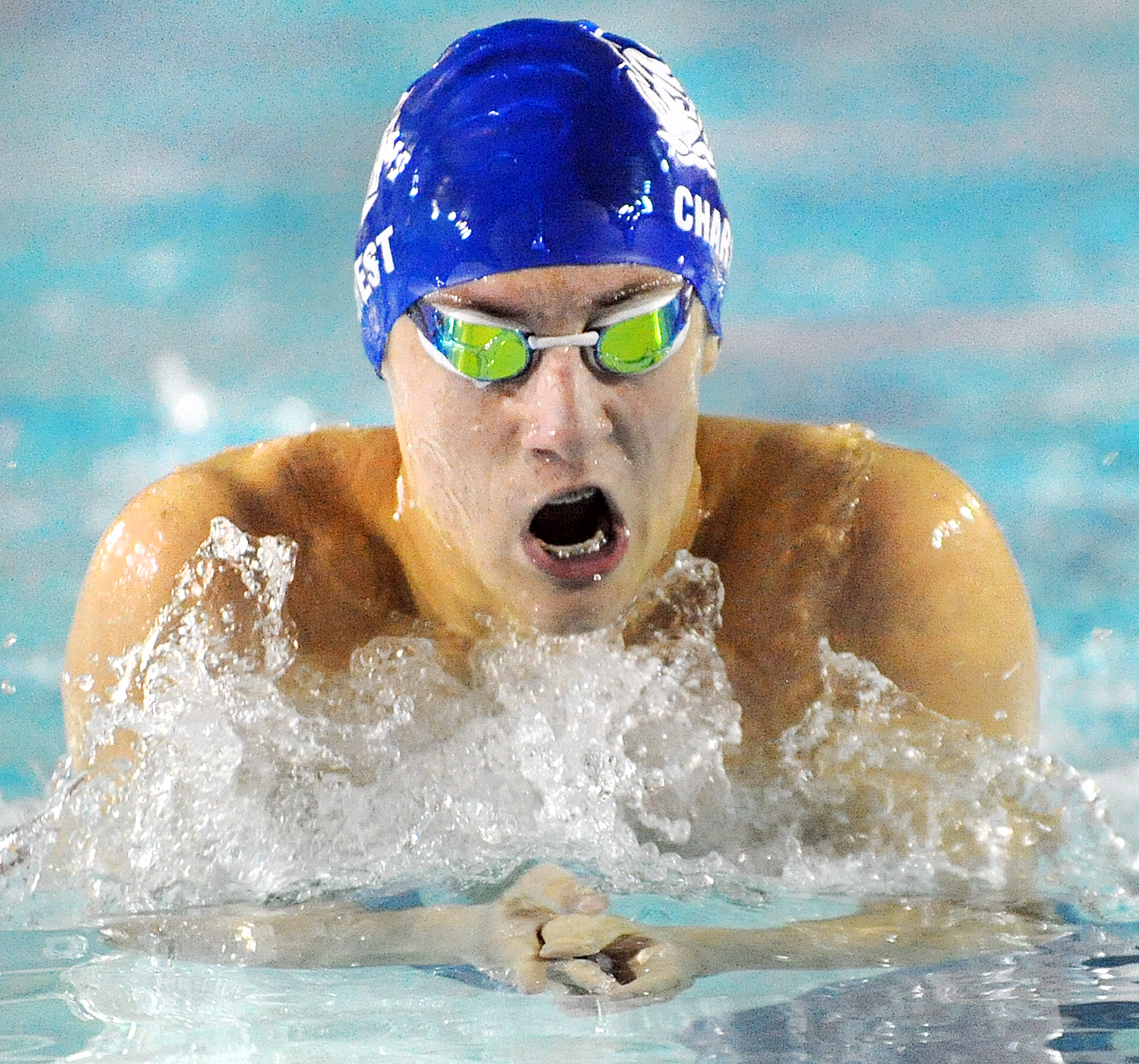 Lewiston’s Matthew Charest churns up the water during the breaststroke portion of the 200 yard individual medley race at the Lewiston YWCA Friday night during a swim meet against EL. He easily won the event.