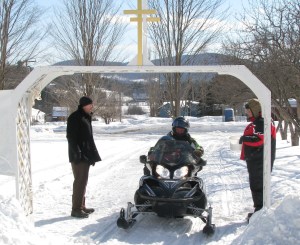 On one side of the arch stood Pastor David Willhoite of the Apostolic Church of Rumford, and on the other, Jon Holmes, president of the Poodunck Snowmobile Club.