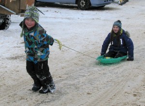 While other ticket prizes were being awarded, Konnor Robin and his family walked by headed for their car. Konnor was pulling his sister, Kylie Robin, both of Rumford, behind him in a plastic sled coming up from the pond.