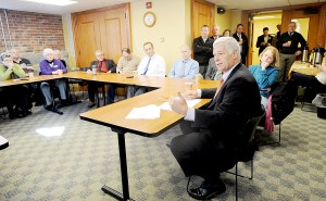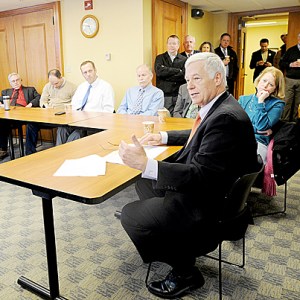 U.S. Rep. and Democratic gubernatorial candidate Mike Michaud holds a small business and community round table at the Auburn Public Library on Thursday. Twenty seven members of the community met with Michaud to talk about topics such as business, education, economic development, the arts, health care, energy and land conservation. Michaud spoke about “Maine Made,” his plan to build Maine’s economy.