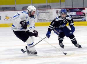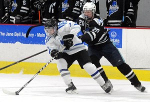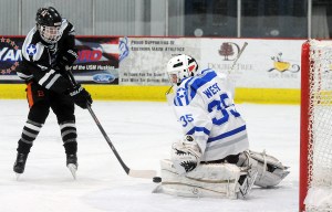 Gosselin set up Poulin in the opening minute of the second to trigger a run of four unanswered goals by the East. Bolduc’s feed led to a laser by Justin Courtney of Bangor for the equalizer, and Anthony Paul of Lawrence/Skowhegan cleaned up a blast by Melvin to put the East in front.