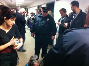 Jammed into the seventh-floor hallway and blocked from Stevenson’s office by USM security and Portland police officers, more than 100 students chanted, “I don’t know but I’ve been told, cutting professors is getting old. Try to take away their jobs, you’ll have to answer to our moms.”