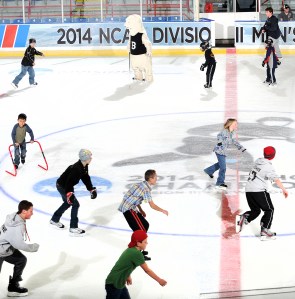 The Bowdoin College polar bear mascot, center, skates around the Androscoggin Bank Colisee in Lewiston on Saturday during a block party prior to the NCAA Division III men’s ice hockey championship game Saturday night. The free, public event included a cookout, outdoor street hockey, a bounce house and inflatable obstacle course, skating, music and games. For more photos from the event, visit sunjournal.com.