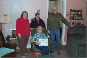 Madeline Brown, 95, Buckfield’s oldest resident, holds the town’s gold-headed Boston Post Cane and a certificate of recognition. The presentation was made Saturday by First Selectman Warren Wright, assisted by Selectmen Martha Catevenis, left, and Carol Coffman.
