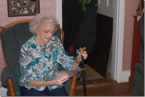 Madeline Brown, 95, Buckfield’s oldest resident, holds the town’s gold-headed Boston Post Cane and a certificate of recognition Saturday. The award was made at a reception at her home. The 1937 graduate of Conley Institute in Cumberland Center has three children, eight grandchildren and seven great-grandchildren.