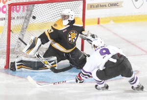 The Bruins ran the score to 5-1 on a Rob Flick goal against Rawlings before Brendan Shinnimin responded with a quick wrister from the center of the slot at 18:05 of the first to pull the Pirates within three at 5-2.