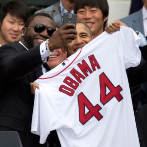 Not all of the ceremonial greeting was quite so serious. David Ortiz, Boston’s best-known player, presented the president with a Red Sox jersey emblazoned with “Obama” and the number 44 on the back, then promptly took a cell phone picture of himself and the chief executive. “What an honor, thanks for the #selfie @BarackObama” he quickly tweeted.