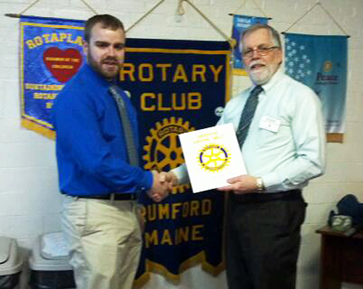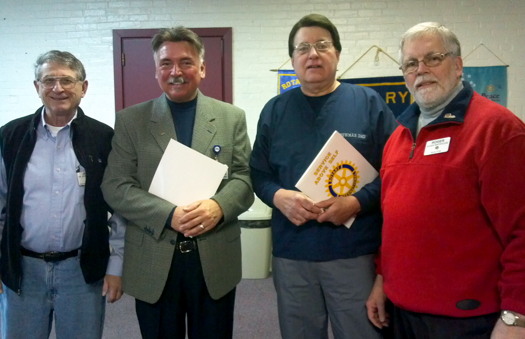 The River Valley Rotary Club inducted several new members this spring. Performing the ceremonies was Roger Whitehouse, club president. In the top photo is Jerry Cohen, Rotarian, who sponsored Mike Newman, the new dentist replacing Dr. Orino; John Ludwig, vice president of operations at Bridgton and Rumford Hospitals; and Whitehouse. In the second photo is Jeffrey LaCroix, administrator of Rumford Community Home, and Whitehouse. LaCroix was sponsored by Joseph Sirois, Rotarian, who was not present for the photo. The River Valley Rotary Club is always looking for new members.