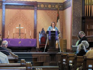 The Good Friday drama “Were You There?” brought readers from area churches to the annual Farmington Area Ecumenical Ministry service at Old South First Congregational Church at noon Friday. The Rev. Alexis Fuller-Wright of Old South reads the words of John, while Judith Tracy and the Rev. David Smith, right, wait their turns. Several attended, although Fuller-Wright acknowledged Good Friday tends to bring fewer because “it’s hard to enter into the pain of another. We’d rather be Easter people.”