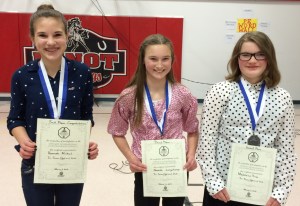 Twelve students from RSU 16 schools participated recently in the annual Tri-Town Optimist Club’s Oratorical Contest at Minot Consolidated School. The sixth-, seventh- and eighth-grade students delivered four-minute speeches on the topic, “How My Passions Impact the World.” First place was awarded to Hannah Mickool, left; second, Madeleine Tiner, right; and third, Neveah Longchamps, center. Other participants were Sophia Nottingham, Twilight Smart-Benson, Halie Barnaby, Olivia Bell, Adanica Keene, Brihanna Swift, Hannah Sawyer, Hailey Johnson and Bartholomew Kimball.