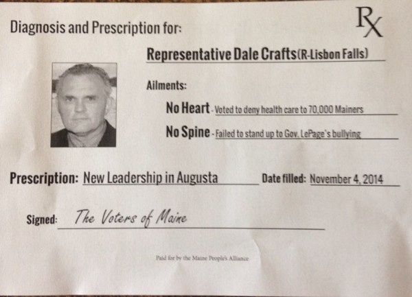 Maine People’s Alliance staff on Monday said the flier was intended only as a commentary on Crafts’ opposition to Medicaid expansion. The same flier — including the prescription language — was also distributed in the districts of other lawmakers who voted against the expansion effort.