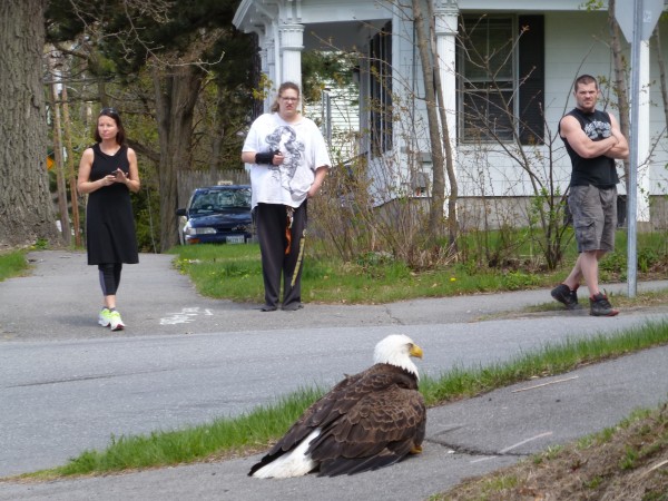 Officers directed traffic and kept spectators at a distance until Maine Game Warden Jim Fahey could arrive. The eagle offered no resistance when picked up, but it did appear unhappy once placed in a pet carrier in the back of Fahey’s pickup truck.