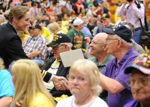 “This is what we look like,” she said, adding that veterans have families, businesses and lives. “They’re the person in Dunkin’ Donuts who you see every time you go in and don’t say hi, then someone realizes he’s a World War II vet who stormed the beaches of Normandy.”