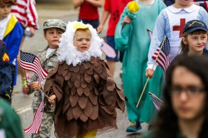 Emma Chapman, 5, wears an American bald eagle costume in the West Paris Memorial Day service on Monday. She and 13 other members of the West Paris Explorers Drama Club, an after-school program, were dressed as characters from the nation’s history. Their costumes were made by leader Eileen Storck.