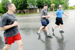 Ryan Bouchard, right, of Lewiston hands the Flame of Hope to Joel Burkhardt, center, of Lisbon Falls during the Maine Law Enforcement Torch Run for Special Olympics on Main Street in Lewiston on Wednesday. Burkhardt’s brother, Lewiston police officer Jeff Burkhardt, left, is one of more than 600 Maine law enforcement officers who will escort the hope torch as it makes its way across the state for Friday’s Summer Games opening ceremony in Orono.