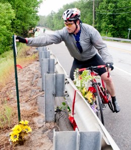 The memorial site at the accident scene, which is approximately 10 miles from the Trek’s start in Newry, was marked with a small, spoke-wheel circle sign bearing his initials, DLC. Below the initials was LeClair’s Trek number, 1945. It was secured to a tall green post behind the guardrail.