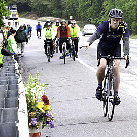 Some bicyclists stopped to photograph the marker, even though all were told not to stop there to they would not create safety hazards.