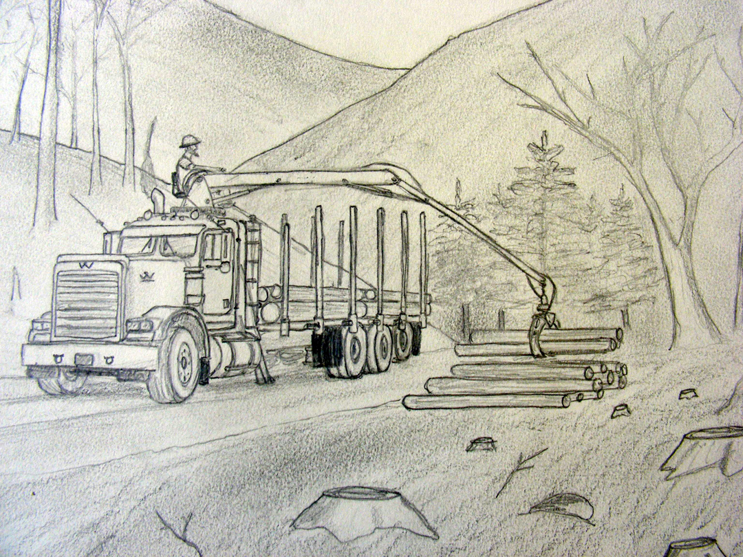 The work, which is titled “Pulp Truck in the Woods,” was created using graphite on paper.