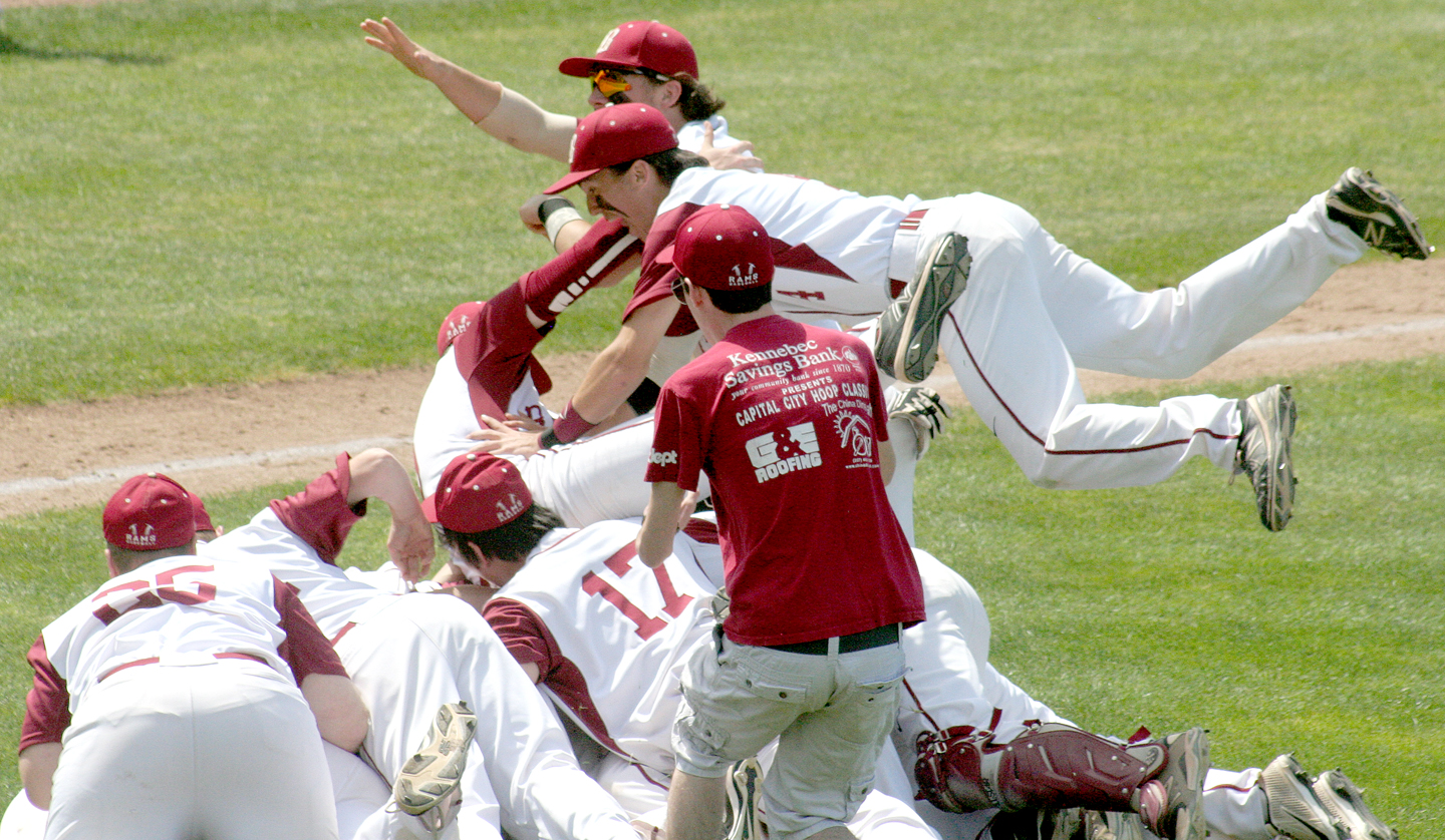 The University of Maine-bound right-hander buckled down instead, racking up his ninth and 10th strikeouts, then braced himself for the dog pile in front of the mound as the Rams celebrated their first Class A state title since 2006 with an 8-0 win over Windham at Mahaney Diamond on the campus of St. Joseph’s College Saturday.