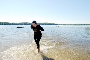 Linda D’Alessandro of Lewiston exits Taylor Pond during a Bates Tri Camp transition exercise on Sunday. “It is really important that you can transition between all three,” co-director David Baker said. Triathlons involve swimming, biking and running with transitions between each discipline.
