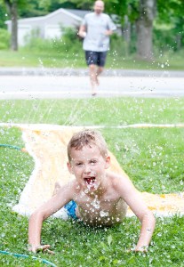 Camden Roy, 6, slides into home plate with an inside-the-water-park home run as his father, Chris, shags the ball while playing Banzai Grand Slam Baseball Slide with his sister and some neighborhood friends in his front yard on East Avenue in Lewiston on Wednesday afternoon.