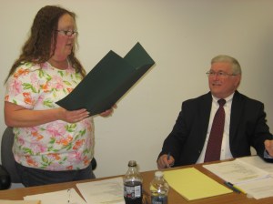 Board Chairwoman Denise Rodzen read a legislative sentiment in honor of Wall’s 45 years in education, including the last 11 in Jay-Livermore Falls.