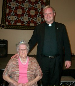 Abbie Maheux is joined by the Rev Aaron Damboise during her recent recognition at The Green Ladle in Lewiston. She was crowned Sodalist of the Year by the St. Anne Sodality of Holy Family Church, Prince of Peace Parish. She was cited for her devotion, time and efforts for the Sodality. She was presented a gift and a plaque. Her daughter Doris, granddaughter Michelle and great- grandchildren Abbie and Cody, as well as Sodality members and friends attended.