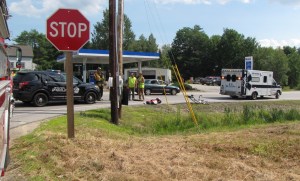 WILTON — A Vermont biker escaped serious injury when he collided with a vehicle, was thrown onto the hood, smashed the windshield and fell onto the road at the intersection of Routes 2 and 4 and Route 156.