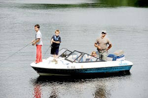 Matt Sherbinski of Otisfield fishes for bass with his children, Payton, left, 12, Cameron, 8, and Katarina, 3, on Norway Lake on Thursday. The Sherbinskis caught both largemouth and smallmouth bass with rods built by Matt Sherbinski.