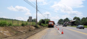 A crew from Farmington Public Works ditches a section of the Wilton Road on Monday. The ditch is not deep enough and water overflows onto the highway, Public Works Director Denis Castonguay said. Using a rented excavator, the crew has done some work on the Farmington Falls and Davis roads. “We’re trying to ramp up our ditch effort,” he said.