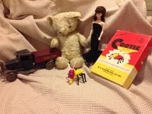 The artifacts include a 1925 wooden truck, a 1959 Barbie doll and a circa 1957 Teddy, owned by association member Polly Bartow.