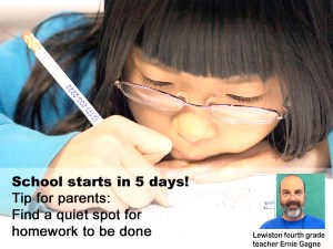 “Although most kids today seem to be good multitaskers, many lack the ability to focus on one topic,” Ernie Gagne, fourth-grade teacher at Lewiston’s Geiger Elementary School, said. “Having a quiet place to do homework, without noise and interruptions from siblings, television and other electronic devices, allows them to complete assignments and hopefully better comprehend what’s being taught.”