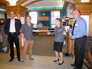 UMF President Kathryn A. Foster bought senior Nathan Libby of Lincoln the first cup of latte purchased from the new addition at 7:30 a.m.