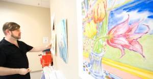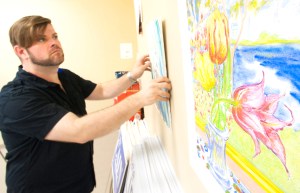 Grayling Cunningham of Lewiston, one of the founding members of Art Walk Lewiston Auburn, hangs artwork at the Coordinated Campaign Office of the Democratic Party on Lisbon Street in Lewiston on Monday morning. Dozens of artists in many mediums, along with music and food, will be spread throughout the downtown of the Twin Cities on Friday from 5 to 8:30 p.m. for the last art walk of the season. For more information, visit their website at www.artwalklewistonauburn.com.