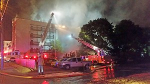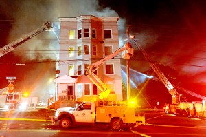 Flames jumped from the roof as a ladder truck directed a blast of water to the fully engulfed porches. Another ladder was set up on Bartlett Street, directing a deluge onto the roof and fourth floor.